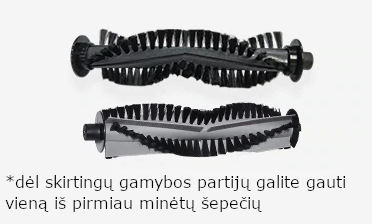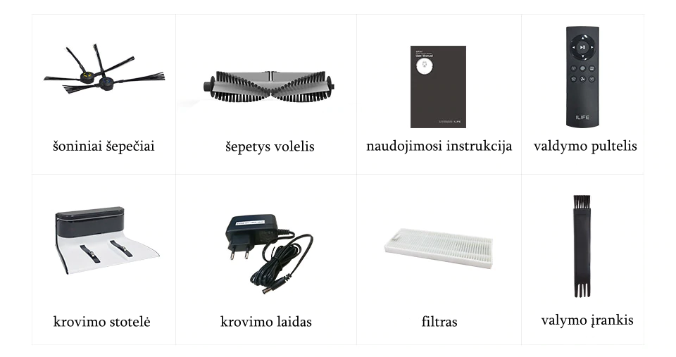 šoniniai šepečiai, šepetys volelis, vartotojo vadovas anglų kalba, nuotolinio valdymo pultas, krovimo stotelė, filtras, valymo įrankis